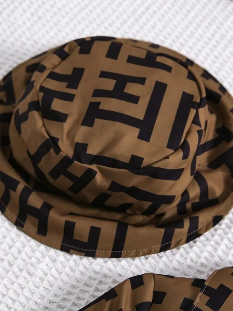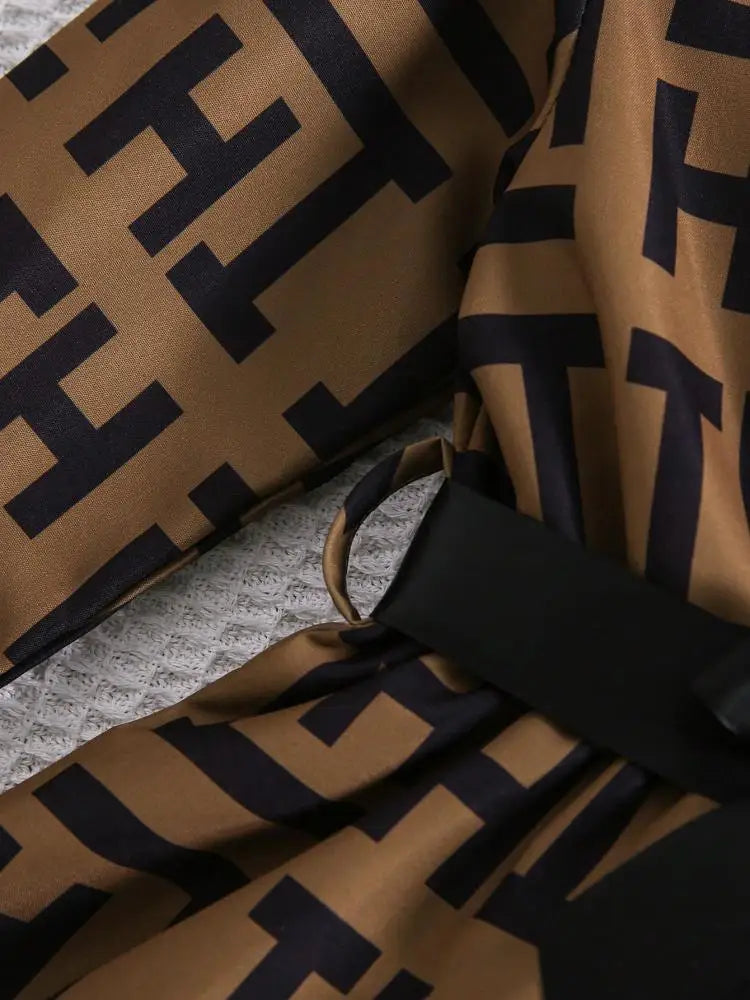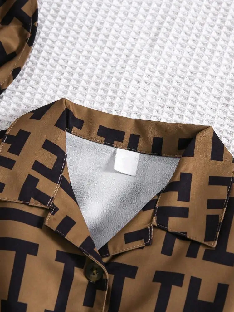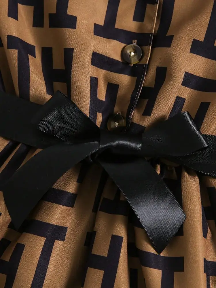 2 Pcs Kid Girls' Fashionable Set Autumn and Winter Geometric Pattern Lapel Long Sleeve Belt Bow Dress and Hat Children's Suit