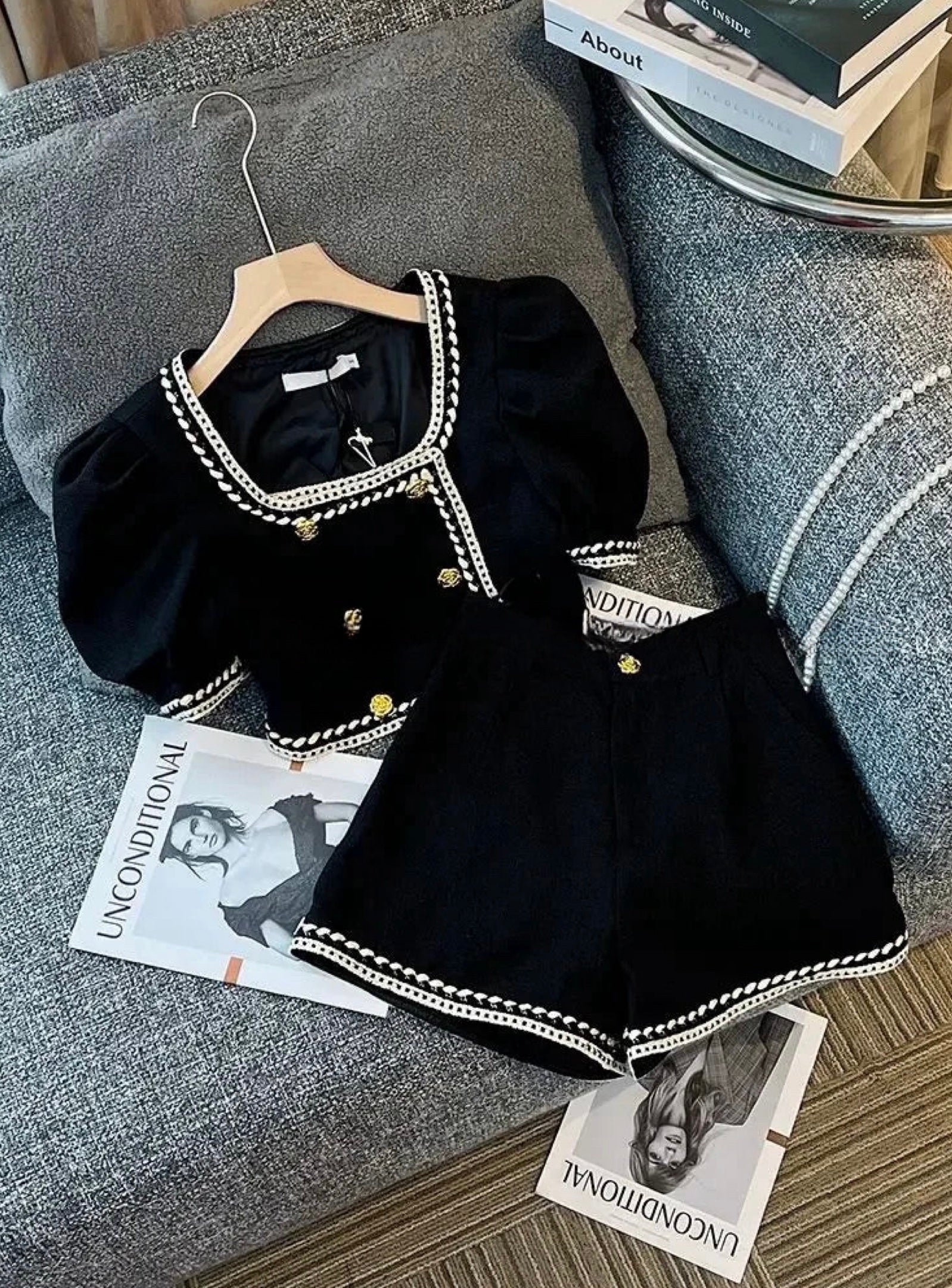 Meet the perfect two-piece set for your little fashionista! This adorable outfit features a chic double-breasted top with charming puffed sleeves that add a touch of vintage-inspired style. Paired with comfortable shorts, it's an effortless way to keep her looking polished and put-together. Whether she's heading to school, playdates, or family gatherings, this set delivers both style and comfort in one delightful package. A wardrobe essential that'll have her feeling like the star she is!