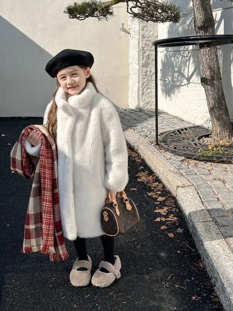 Wrap your little one in luxury with this plush faux fur coat—a winter essential that's as cozy as it is chic. Featuring a crisp stand-up collar and thick, soft fabric, this white beauty keeps kids warm through chilly autumn and winter days. The rich texture adds instant sophistication to any outfit, while the cold-resistant material ensures comfort when temperatures drop. Perfect for creating those picture-perfect moments while keeping your child snug and stylish.