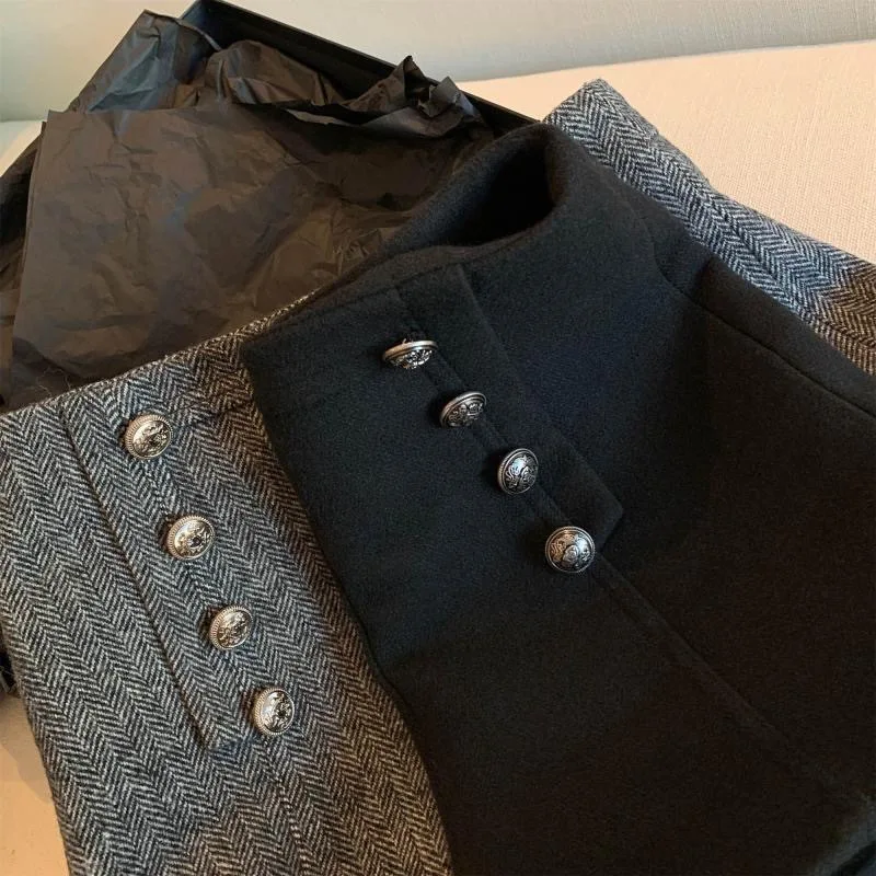 Girls Autumn and Winter New Retro Herringbone Woolen Shorts British Style Versatile Double Breasted Buttons Outerwear