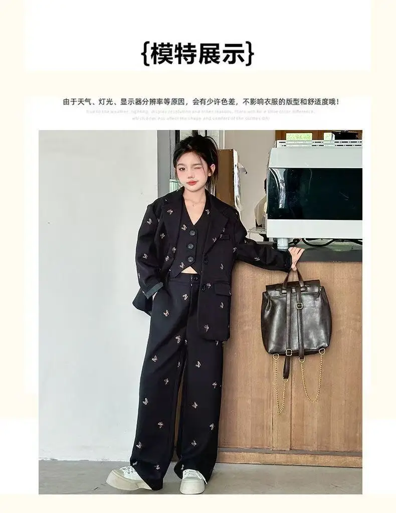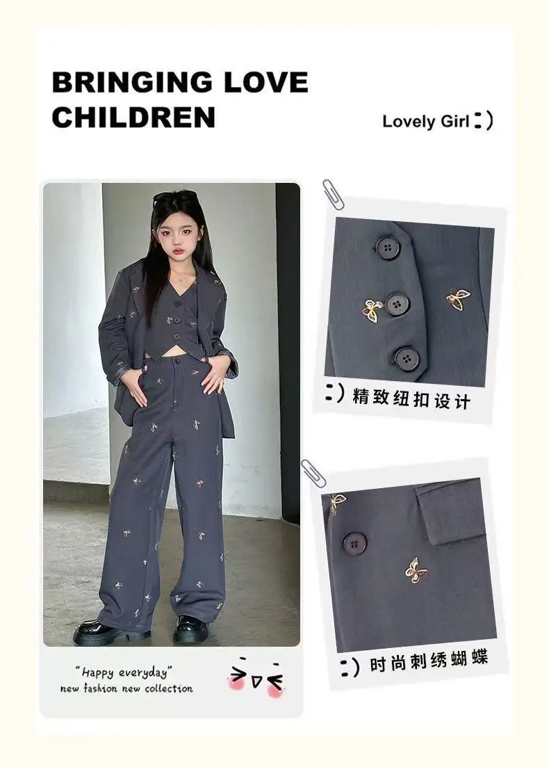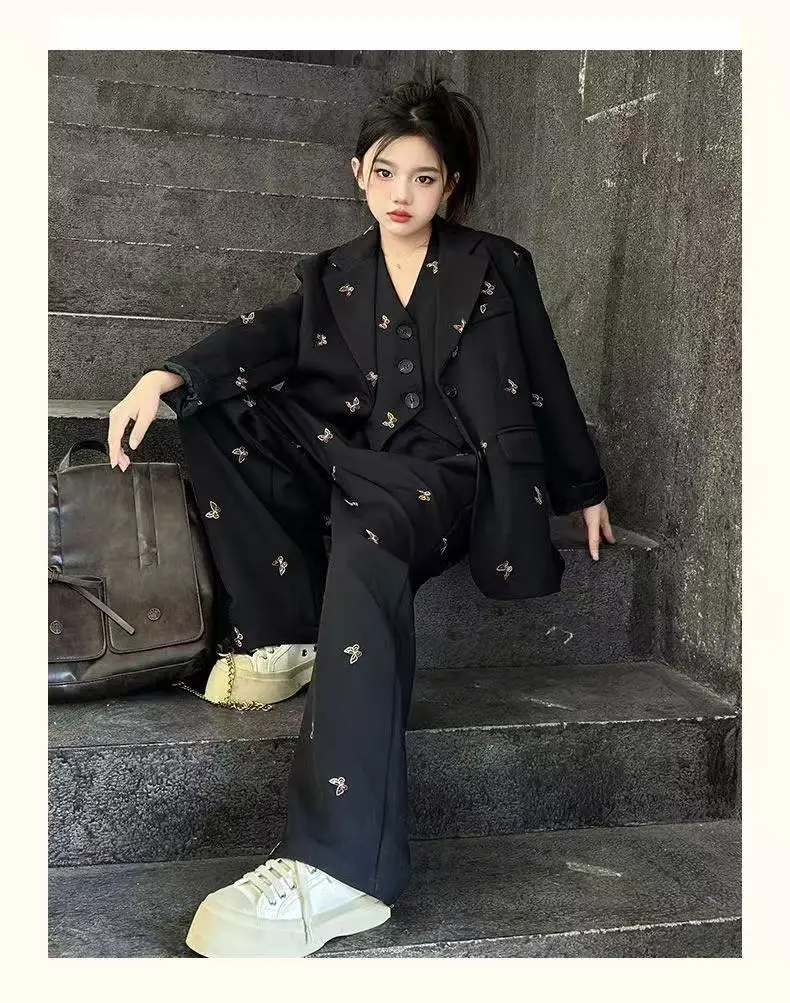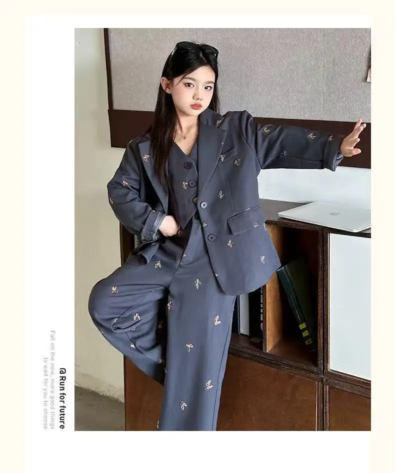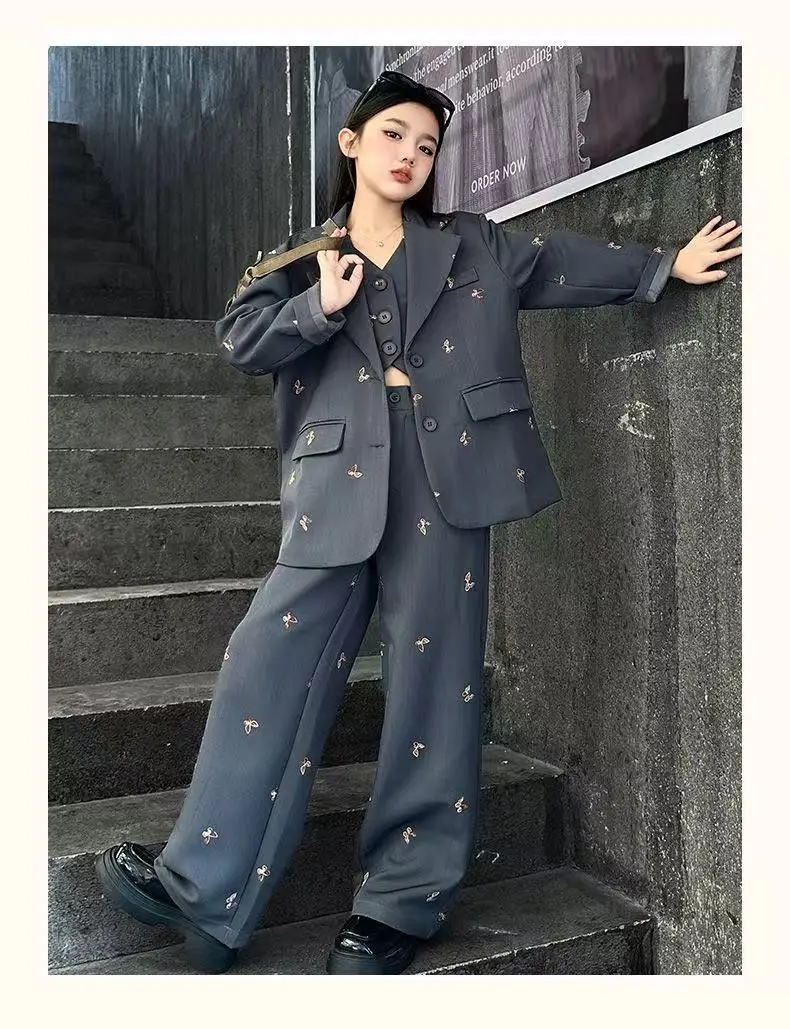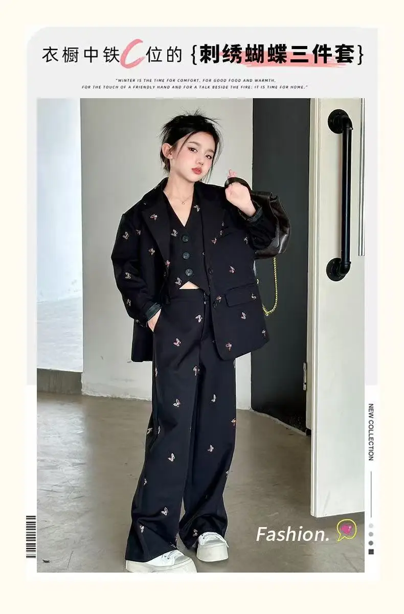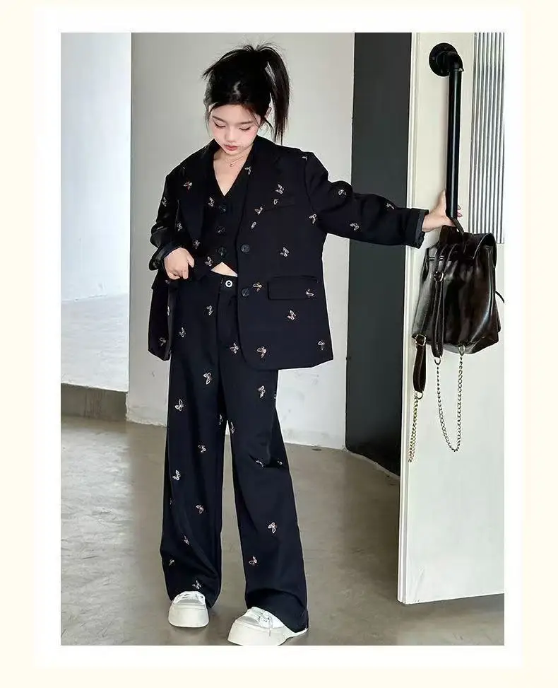 Girls Suit Fashion Butterfly Embroidery Blazers Trousers Vest 3-piece Spring School Kids Clothing Set Teen Child Formal Uniform
