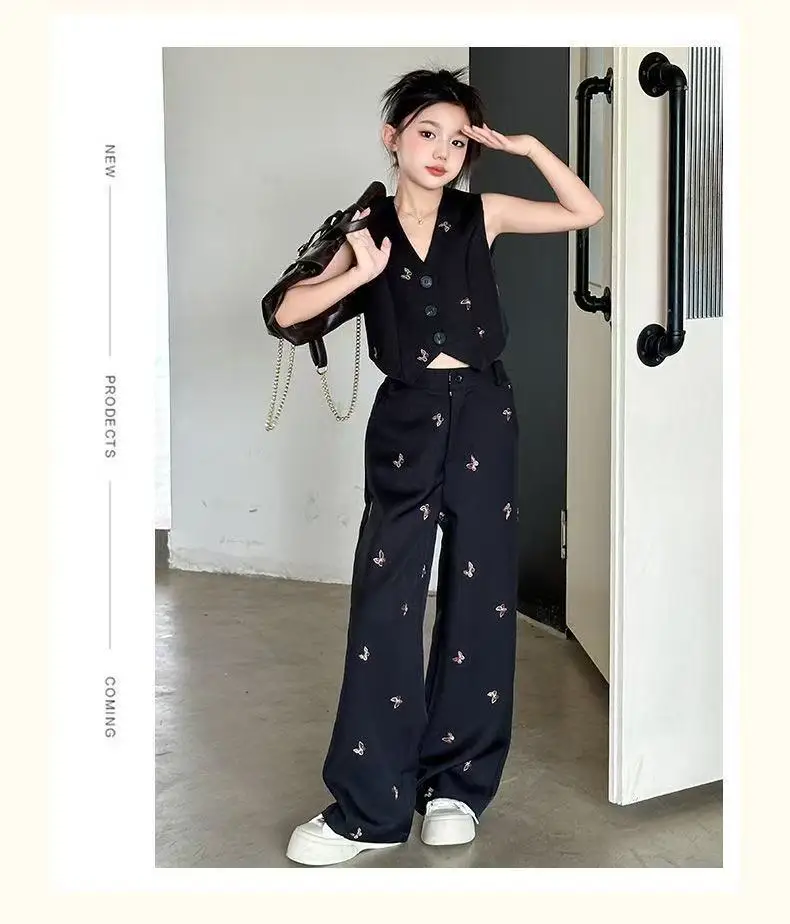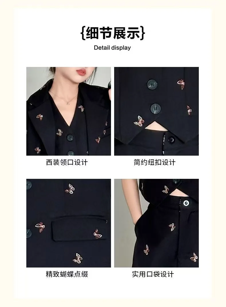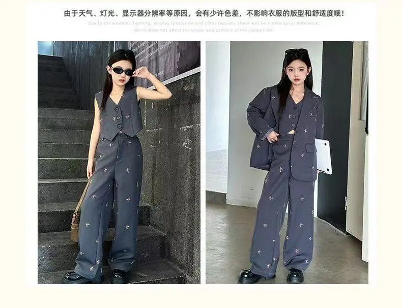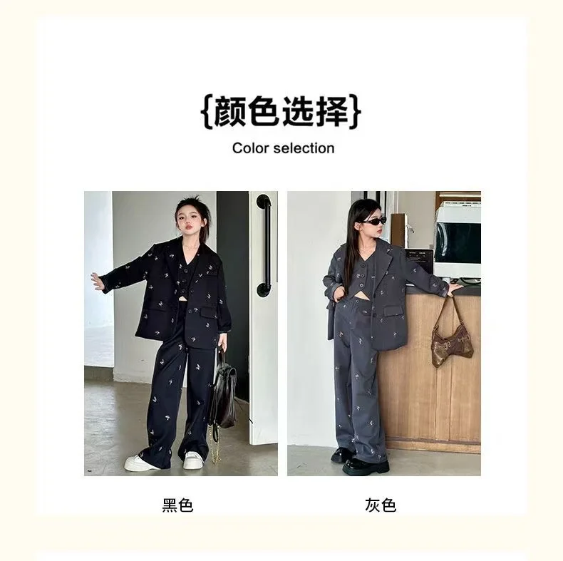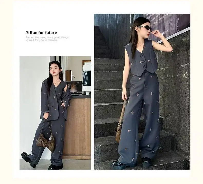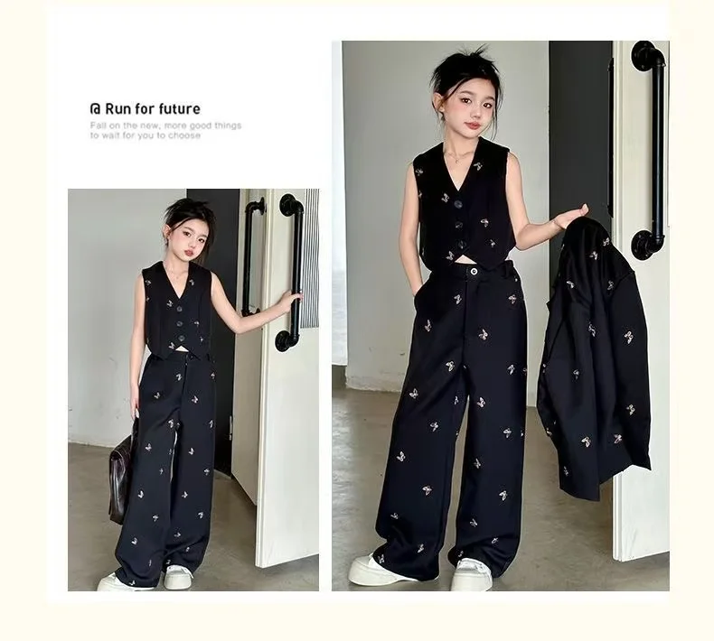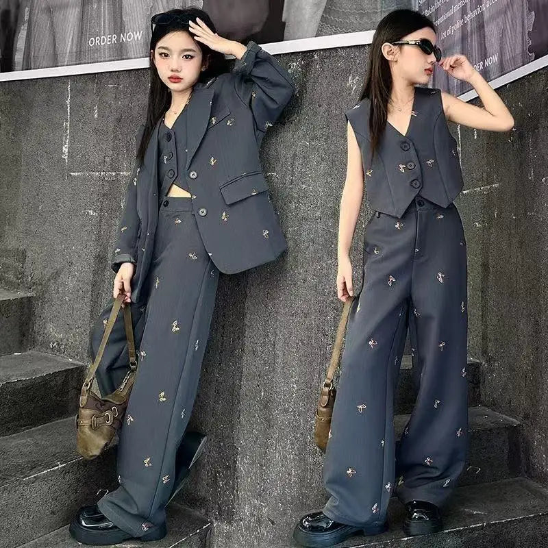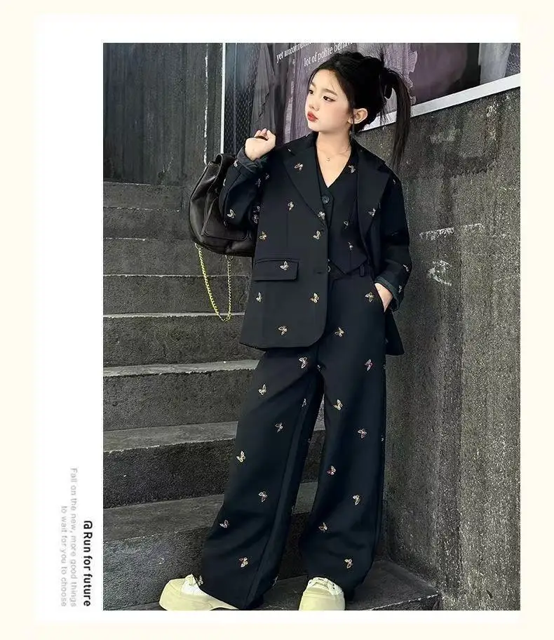Girls Suit Fashion Butterfly Embroidery Blazers Trousers Vest 3-piece Spring School Kids Clothing Set Teen Child Formal Uniform