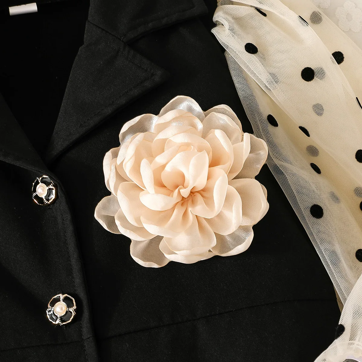 Elevate your girl's wardrobe with this chic blazer dress that blends sophistication with fun! Featuring a striking black silhouette, delicate front flower appliqué, and short sleeves, it's the perfect pick for special occasions, family gatherings, or dress-up days. The tailored blazer style gives off confident, polished vibes while the playful floral detail adds a touch of whimsy. Comfortable enough for all-day wear, this formal dress lets your little one feel fabulous and fashion-forward.