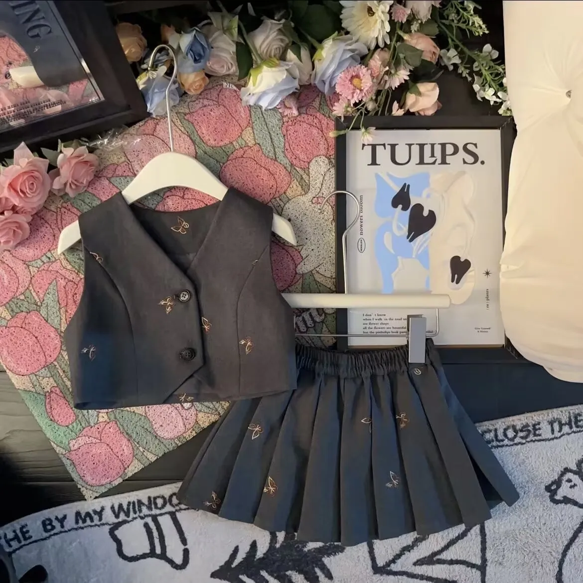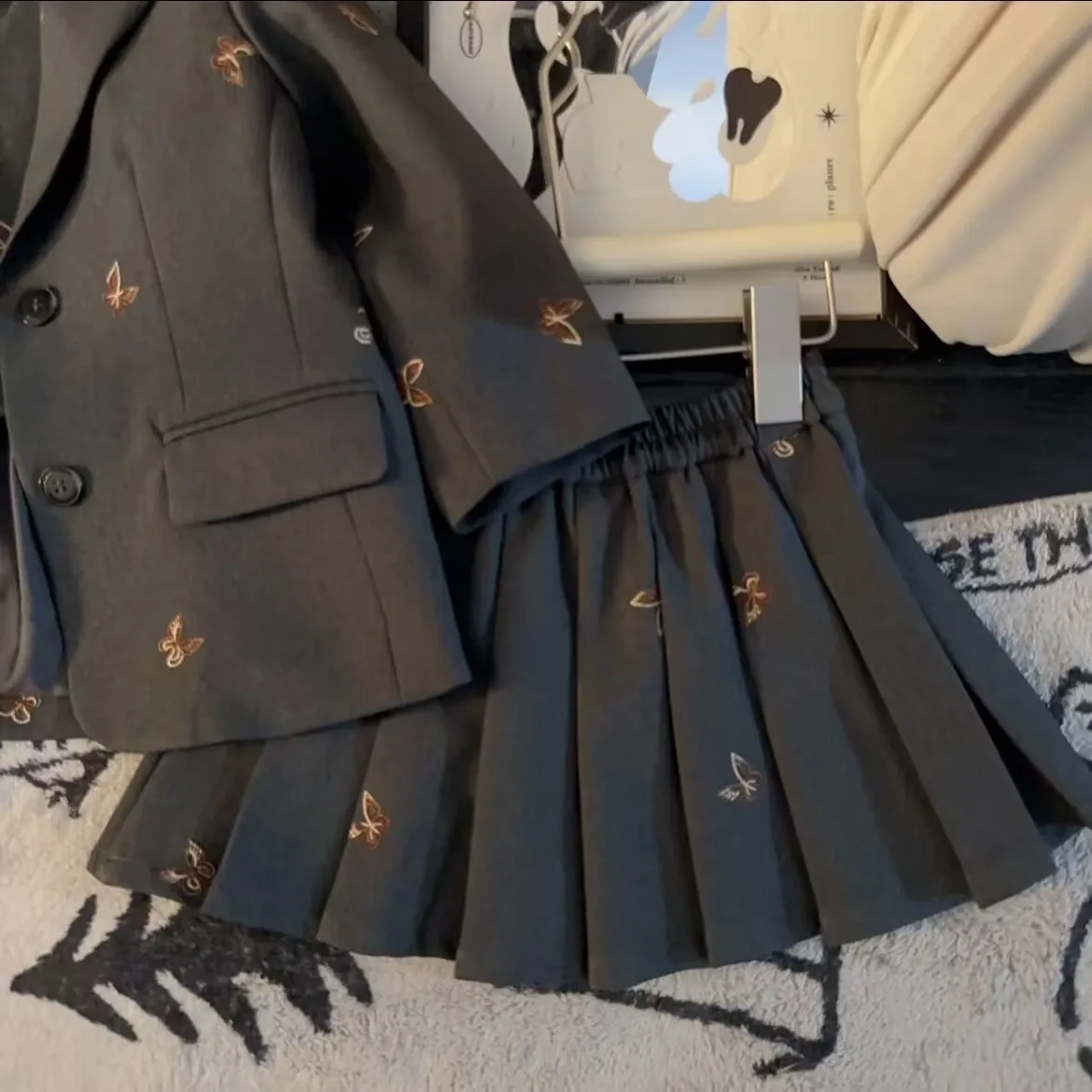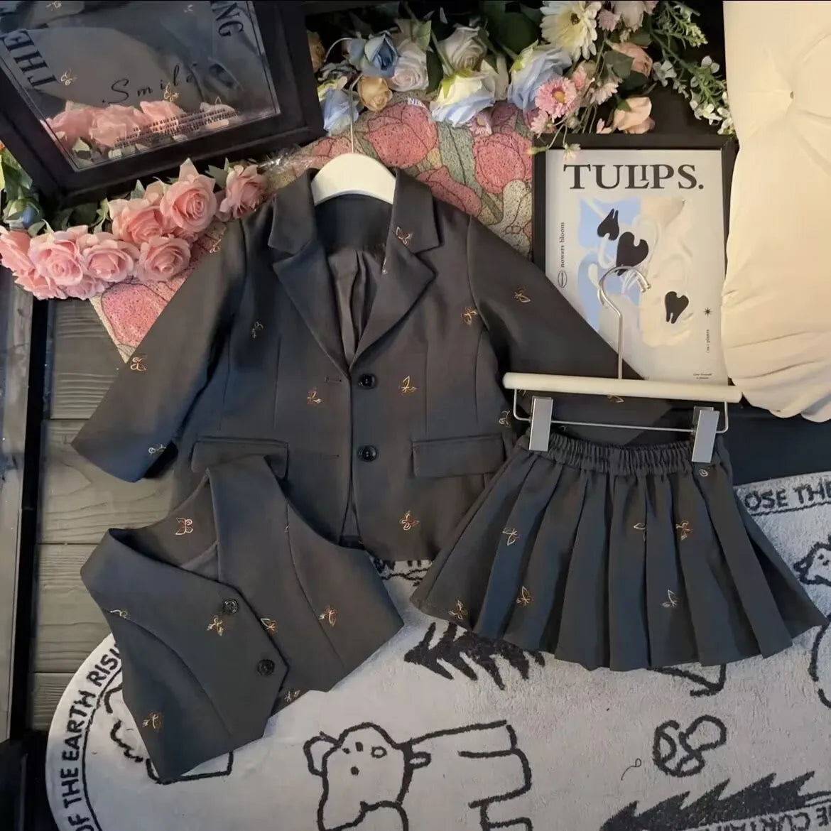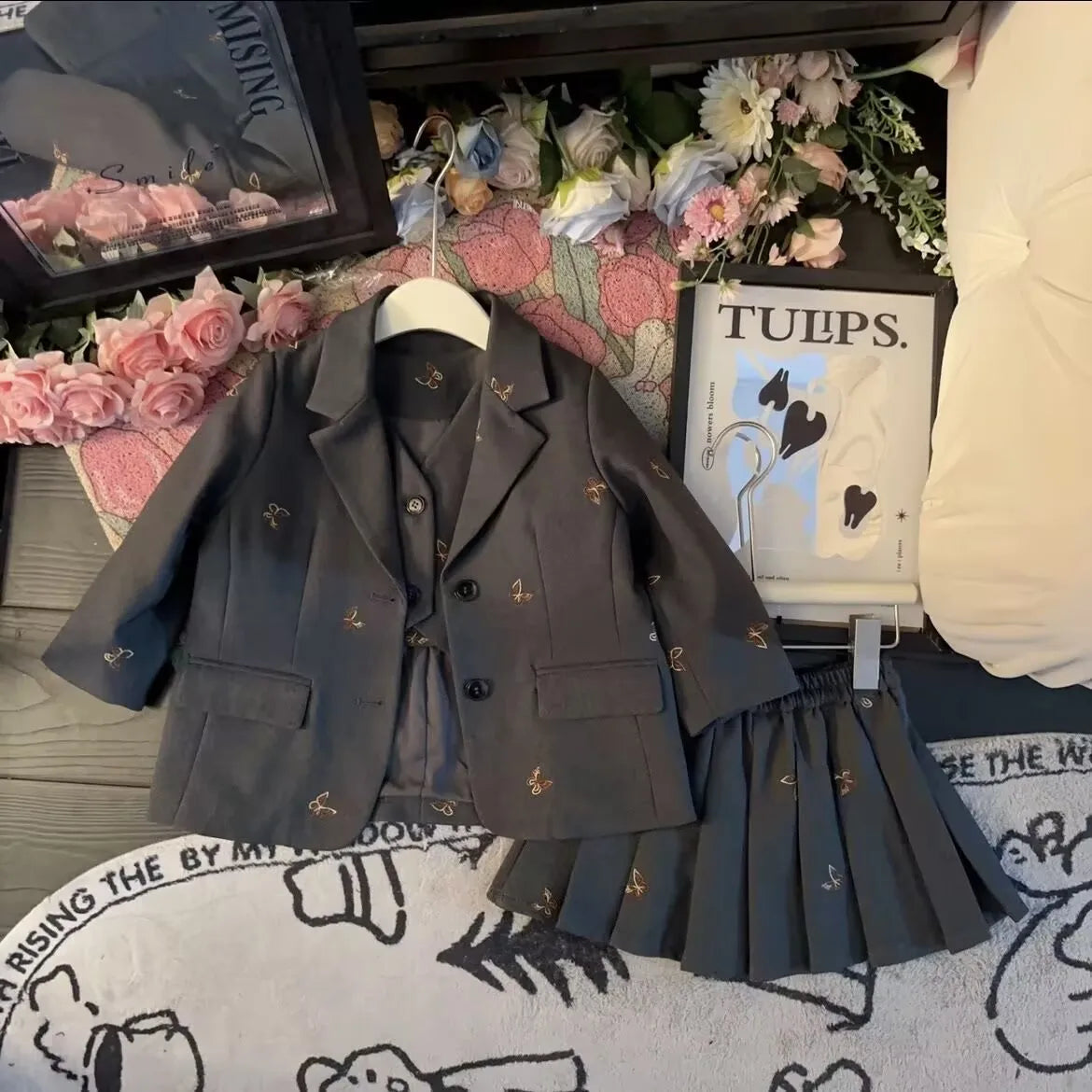 Girls suit set Embroidered Butterfly suit jacket Vest Pleated skirt 2/3pc baby girl clothes suit junior child outfits 2-13