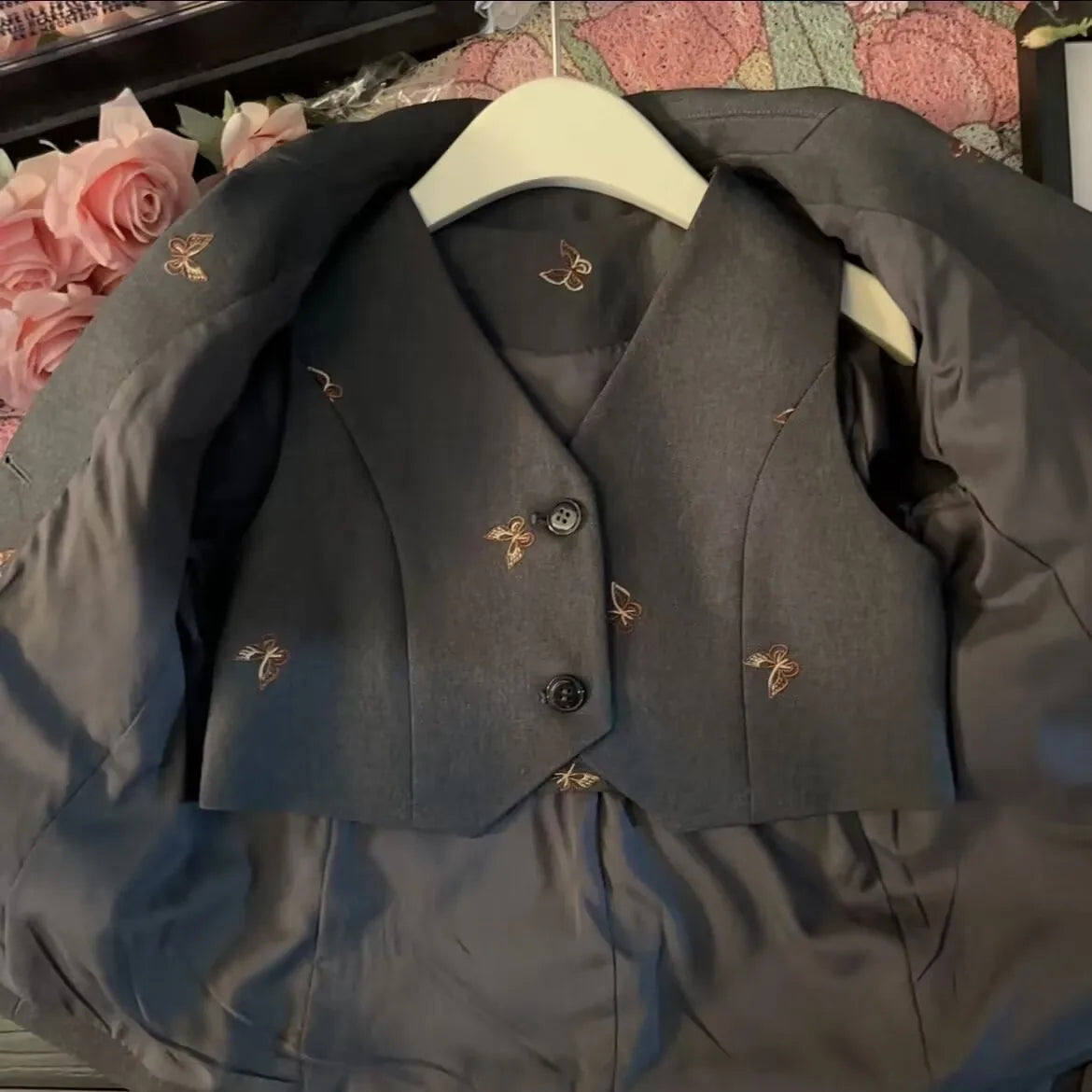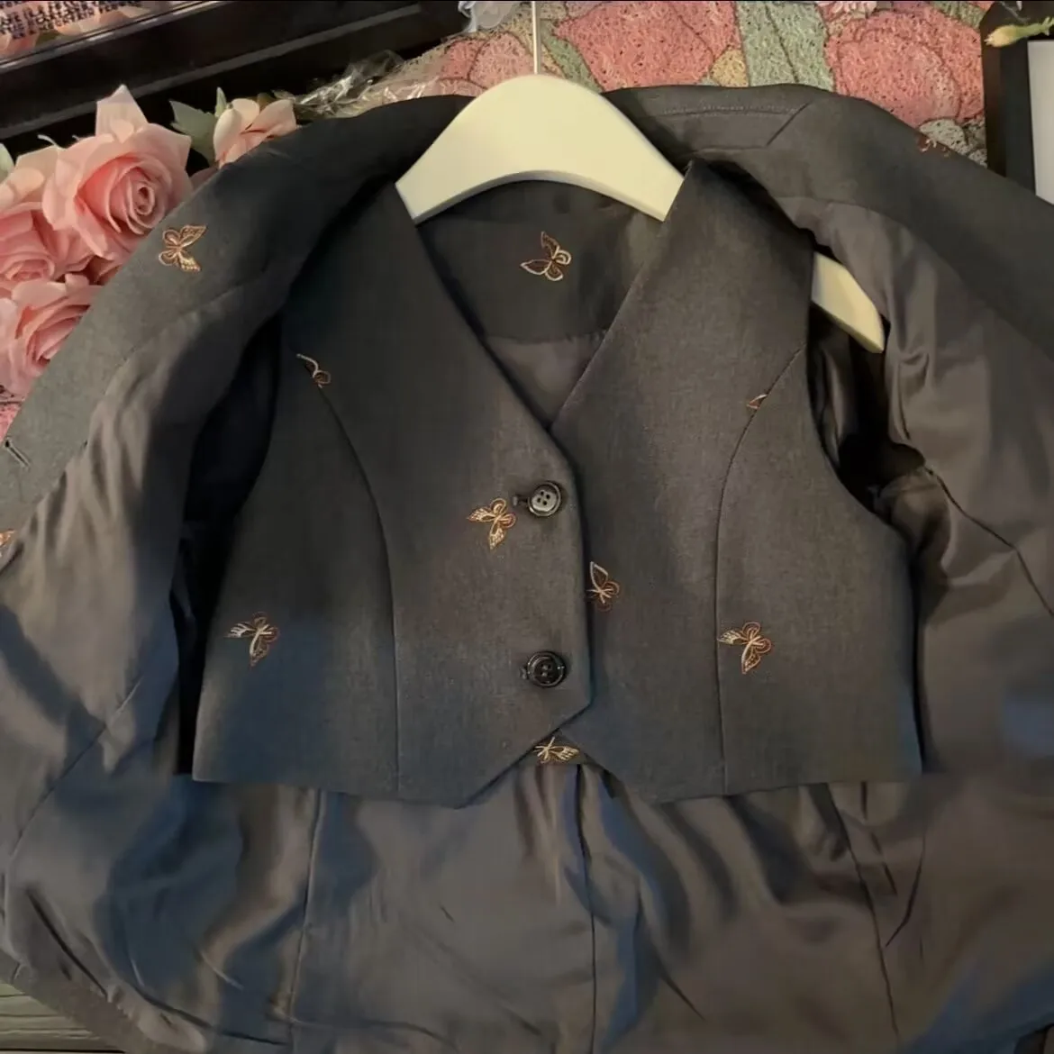 Fluttering into style! This charming girls suit set features delicate embroidered butterfly details that bring whimsy to everyday wear. Mix and match the tailored jacket, coordinating vest, and pleated skirt to create multiple looks from one versatile set. Perfect for special occasions, school events, or when your little one wants to feel extra fancy. Soft, quality fabrics ensure comfort throughout the day, while the classic silhouette keeps her looking polished and put-together. Available in sizes 2-13 for growing girls.